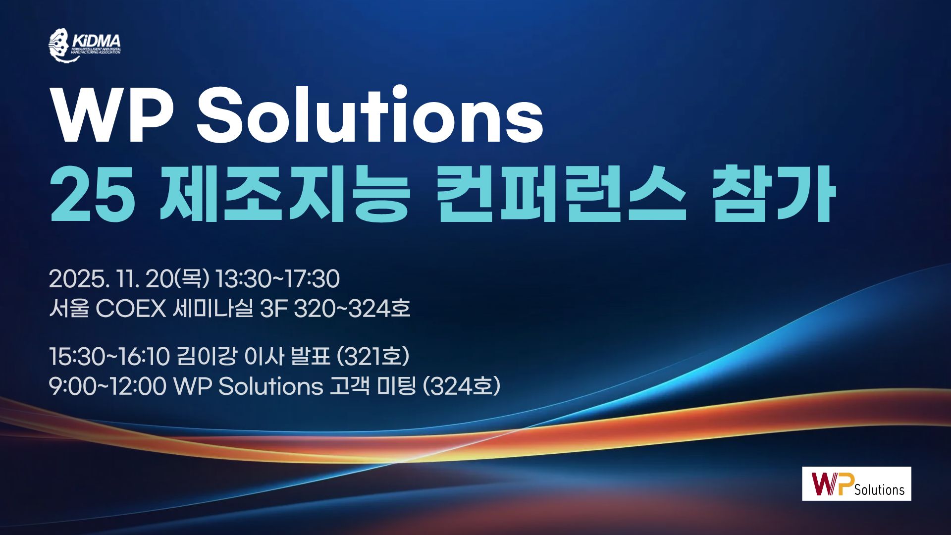 안녕하세요. IT 솔루션 개발 전문기업 더블유피솔루션즈입니다. 당사가 2025년 11월 20일(목), 서울 COEX 세미나실(3F)에서 열리는 2025 제조지능 컨퍼런스 (주관: KiDMA)에 발표기업으로 참가합니다. 이번 컨퍼런스는 제조지능 분야의 산학연 전문가와 수요기업이 한자리에 모여 최신 기술과 미래 전략을 공유하는 자리입니...